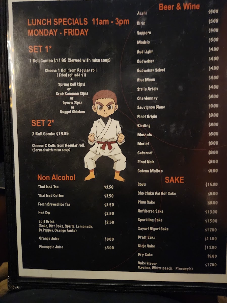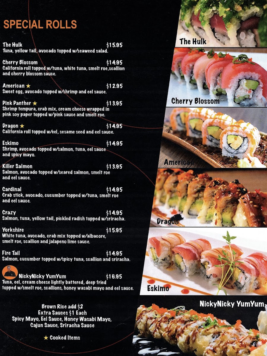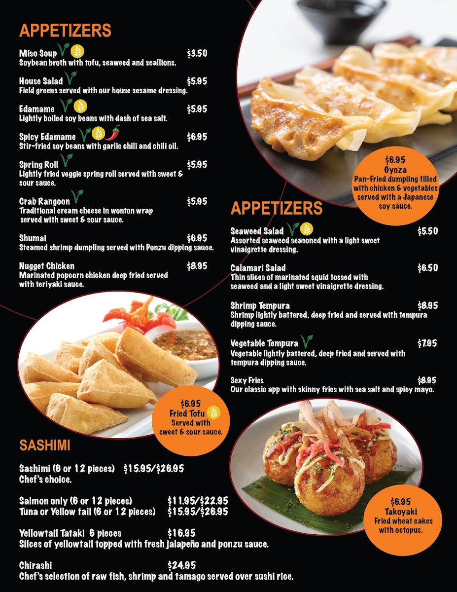 For those seeking lighter bites or appetizers, options include classic Japanese small plates such as Gyoza, Crab Rangoon, Takoyaki, Spring Rolls, and various sushi rolls including specialty rolls like Wolverine Roll and Veggie Roll.