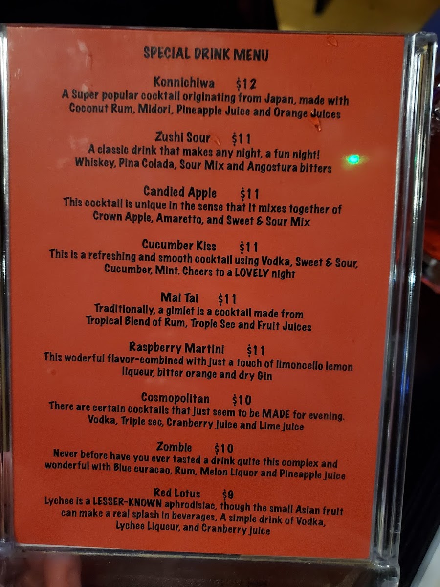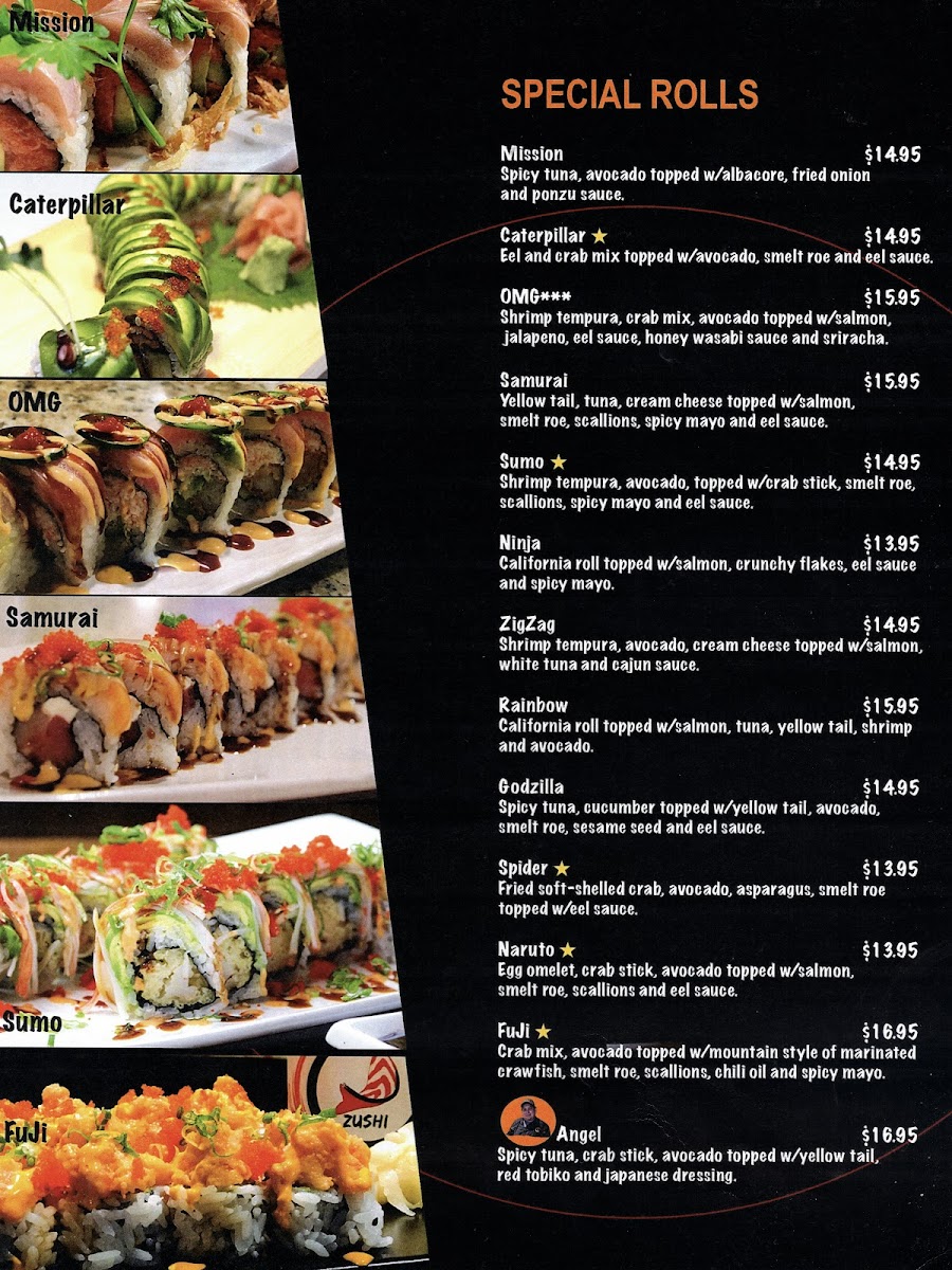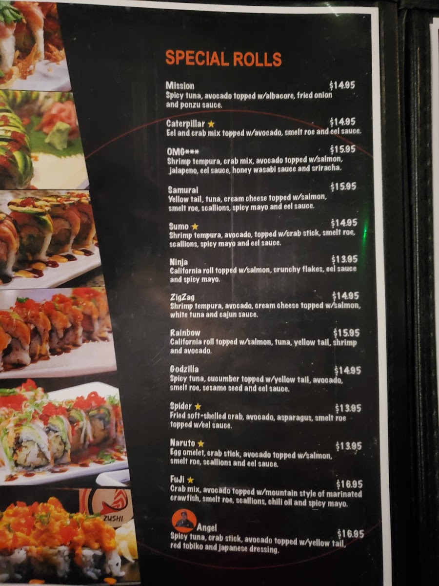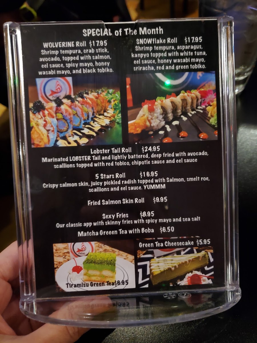 For those seeking lighter bites or appetizers, options include classic Japanese small plates such as Gyoza, Crab Rangoon, Takoyaki, Spring Rolls, and various sushi rolls including specialty rolls like Wolverine Roll and Veggie Roll.