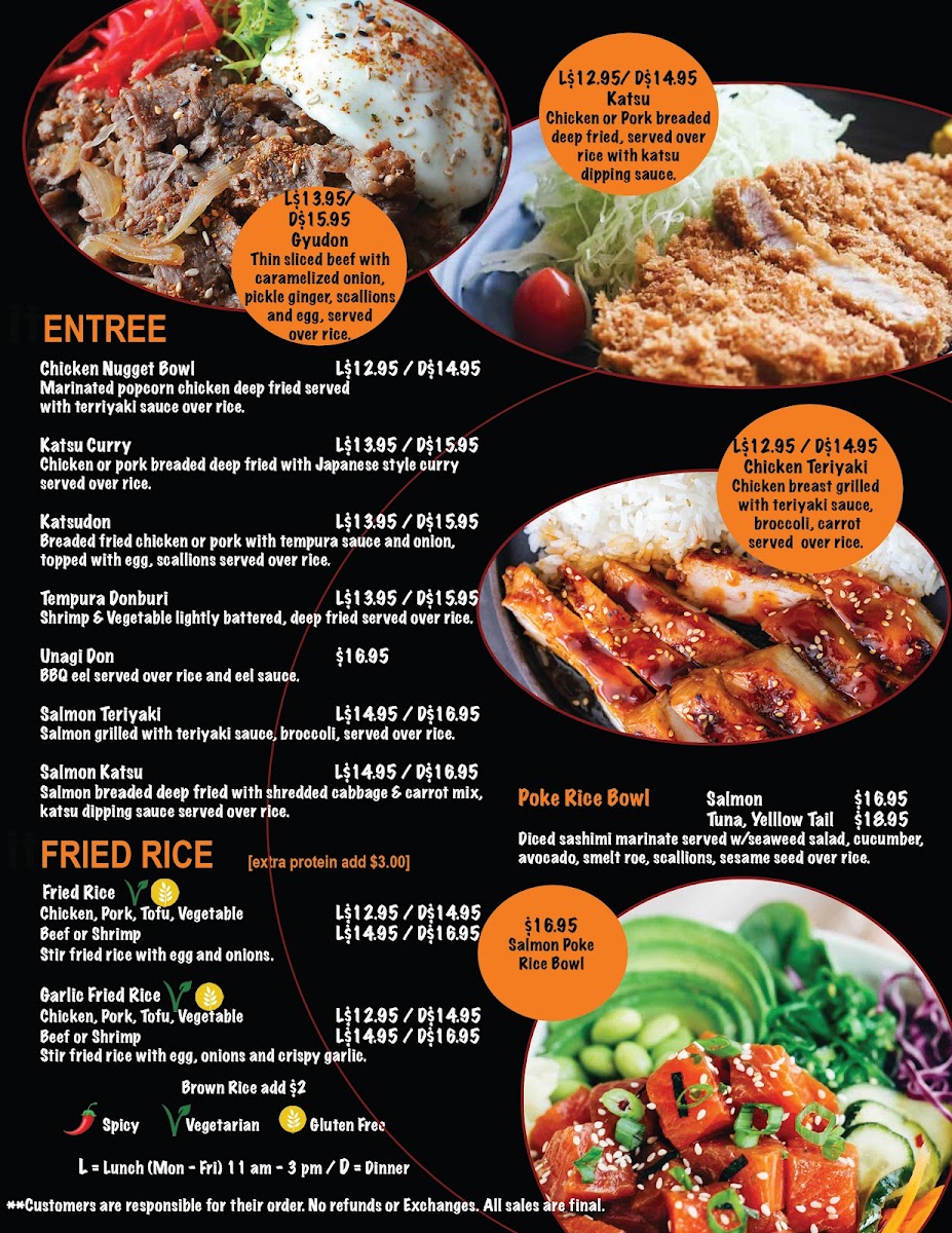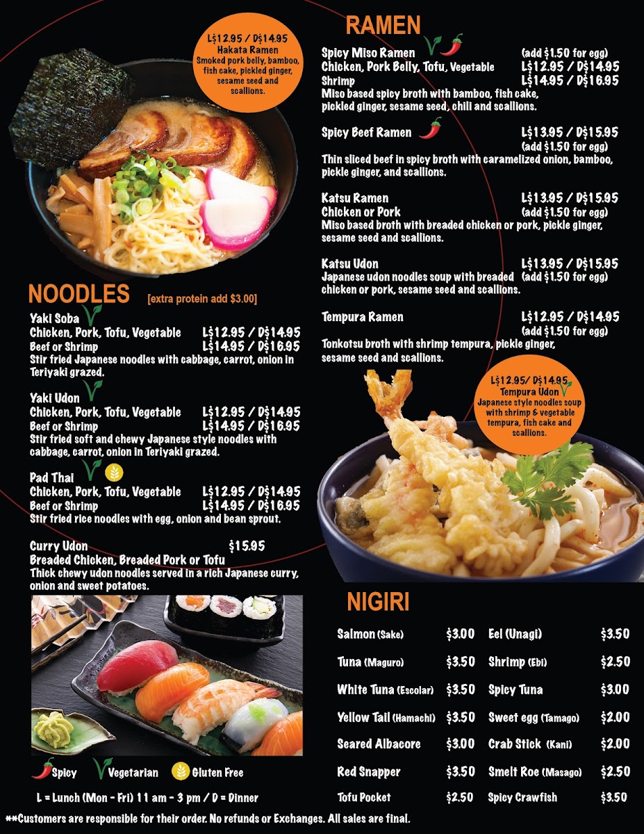At this location, the menu features a variety of Japanese cuisine with a focus on sushi and ramen. Diners can choose from several entree noodle dishes including different styles of udon and ramen, such as Curry Udon, Hakata Ramen with smoked pork belly, Katsu Ramen with breaded chicken or pork, and Katsu Udon. These noodle dishes typically come with ingredients like vegetables, pickled ginger, sesame seeds, and scallions.